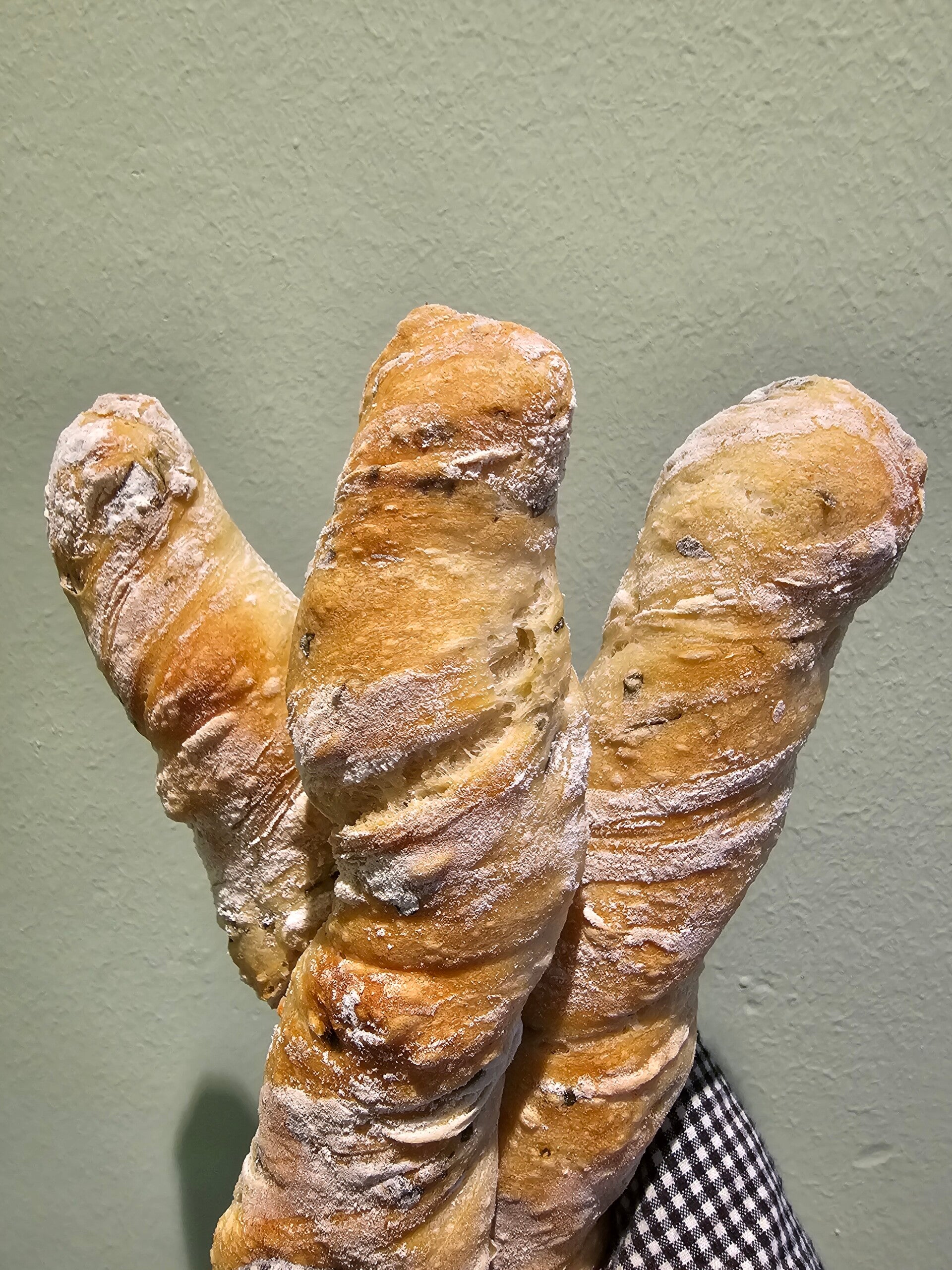 Unsere Dinkel Olivenstange ist jeweils von Montag bis Freitag erhältlich und passt perfekt zu deinem Salat oder Grill.